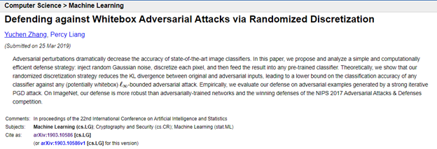 - Zhang, Y., & Liang, P. (2019). Defending against Whitebox Adversarial Attacks via Randomized Discretization. Retrieved from http://arxiv.org/abs/1903.10586