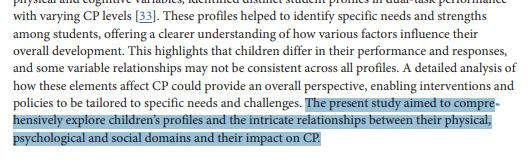 Therefore, in the end of the review, he frames his research objective as “The present study aimed to comprehensively explore children’s profiles and the intricate relationships between their physical, psychological and social domains and their impact on CP” as shown below.