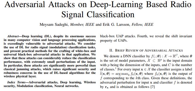 Sadeghi & Larsson (2019) has also focussed on deep learning algorithms with respect to adversarial attacks. It has been seen that deep learning is very vulnerable to these types of attacks in spite of its success in other applications. This paper uses deep learning for radio signal applications and hence considers both black box and white box attacks. The classification efficiency is greatly reduced by these attacks with lots of perturbations in the input side. The work has been analysed, and it has been seen that not much power is required for inducing the attacks into the signals. On the other hand, conventional jamming requires lots of power to attack. Hence, it has been conveyed that there is a loophole in using deep learning techniques.