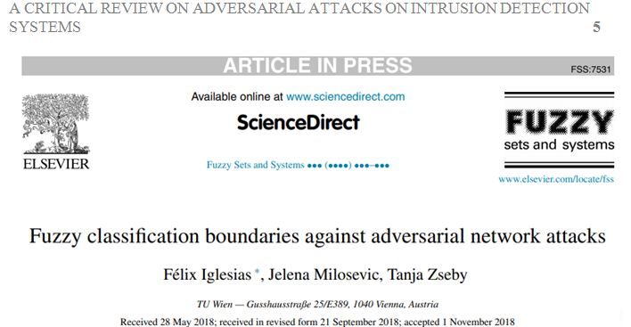 Iglesias, Milosevic, & Zseby,(2019) has proposed fuzzy-based approach for classifying the boundaries against adversarial attacks. The methods will learn on their own for preventing the attackers from taking advantage. These attacks are either modified old attacks or new network attacks. This paper has proposed to distort the boundaries of a classification approach to improve the efficiency of detection of the attacks. This is done to fix the problem where the machine learning has learning deficiency due to the fixed boundaries. The distorted boundaries fix this issue and hence the training takes place well. Decision Tree approach has been used as a classification technique and it has been tested with both linear decision tree and fuzzy decision tree. It has been seen that the performance of the classification has improved when the membership score is considered as additional feature. Since fuzzy is used, it is easier for identifying the adversarial attacks.