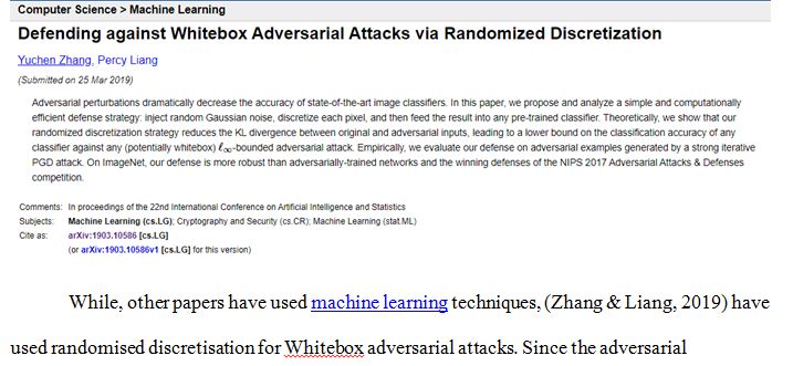 While, other papers have used machine learning techniques, (Zhang & Liang, 2019) have used randomised discretisation for Whitebox adversarial attacks. Since the adversarial perturbations reduce the accuracy of the classification, a simple and effective defence strategy is proposed and analysed. First, random Gaussian noise is introduced, and then the pixels are discretised and then given to any classification approach. It has been seen that this randomised discretisation decreases the differences between actual and adversarial packets leading to better effectiveness in terms of classification accuracy. Datasets are selected and then implemented for measuring the performance. It has been seen that the proposed approach boosts the efficiency of detecting the adversarial attacks. In this work, a novel classification technique is not proposed, but it is tested on existing techniques.