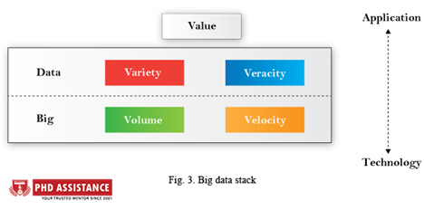 Volume, velocity, variety, veracity, and value are the five dimensions of big data. Starting from the bottom, we organised the five dimensions into a stack of high, data, and value layers. The data layer is integral to big data, and the meaning factor characterises the influence of big data real-world applications. The lower layer is more reliant on technical advancements, while the higher layer is more focused on applications that leverage big data’s strategic strength. Established machine learning paradigms and algorithms must be modified to understand the potential of big data analytics and to process big data efficiently [4].